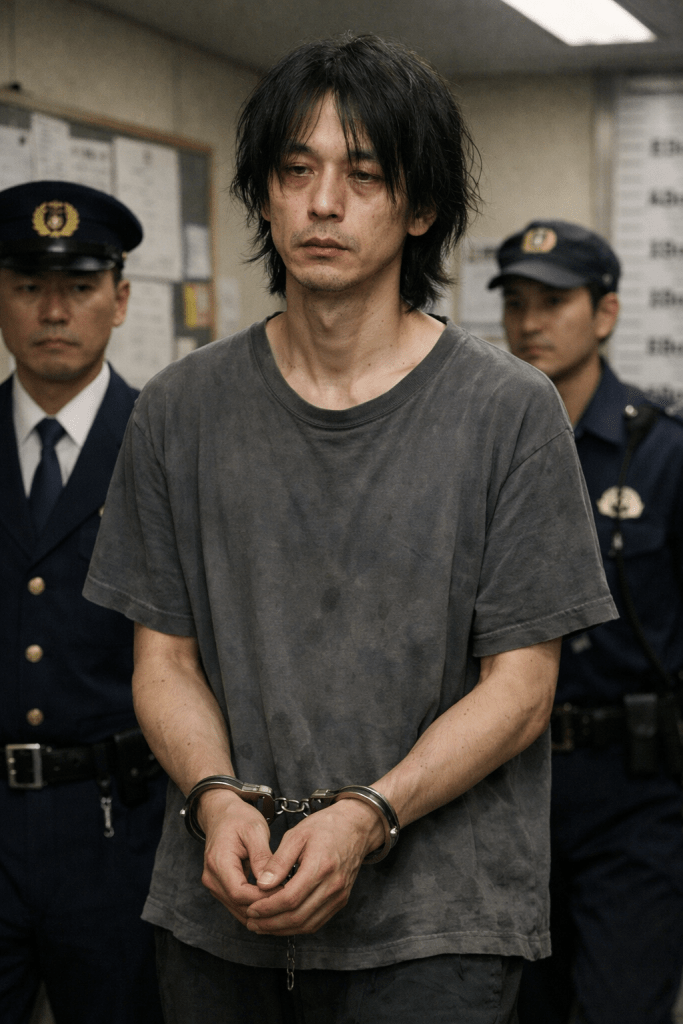 Foi trazido para dentro da delegacia algemado um indivíduo japonês, alto, magro, de cabelos compridos até a altura dos ombros. Ele parecia meio suado, assustado e com aparência de quem não tomava banho há uns dois dias pelo menos.